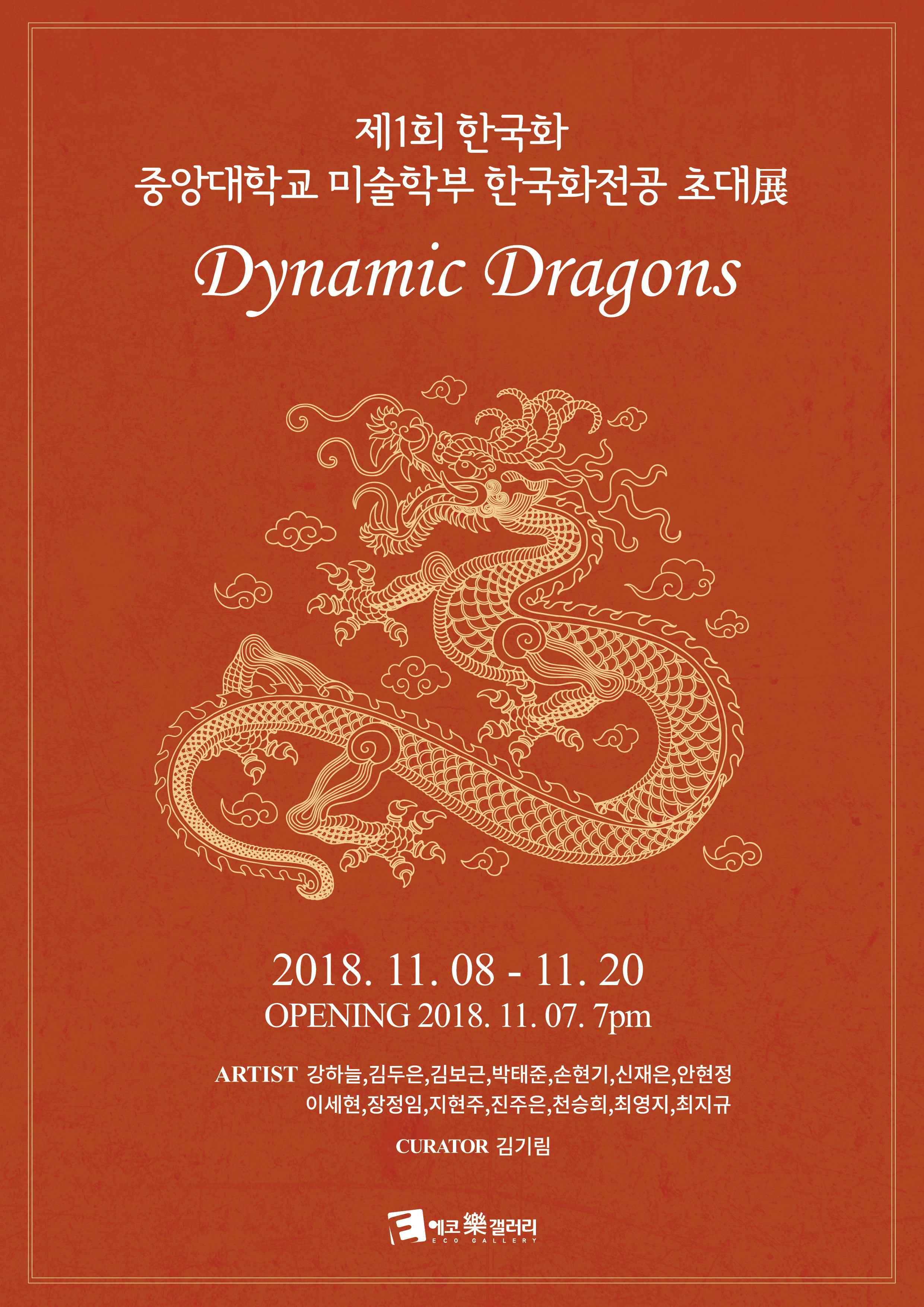 에코락갤러리의 “제1회 한국화 展 : Dynamic Dragons”은 젊은 작가들에게 한국화의 미래를 고민하고 모색하는 좋은 기회라 생각합니다. 중앙대학교를 졸업한 젊은 작가들에게 이러한 좋은 기회를 제공해 주신 장현근대표님께 감사의 말씀 전합니다.
